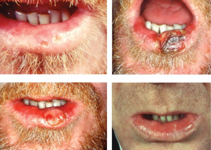 | Due piccoli tumori del labbro prima (in alto a sx), 4 giorni dopo la PDT (in alto a destra), 14 giorni dopo la PDT (in basso a sinistra), 1 mese dopo (in basso a destra).